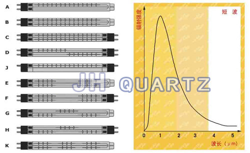 短波石英灯采用带支架圈的钨丝做辐射体,封闭在石英玻壳中,其波长范围为 0.8-1.8 微米,在 1.2 微米时达到峰值。