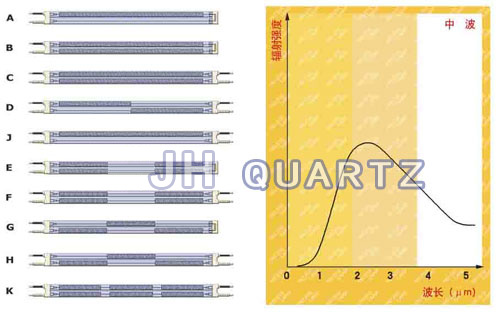中波石英灯采用铁铬铝电阻丝做发热体,波长在 2.2-3.5 微米之间。